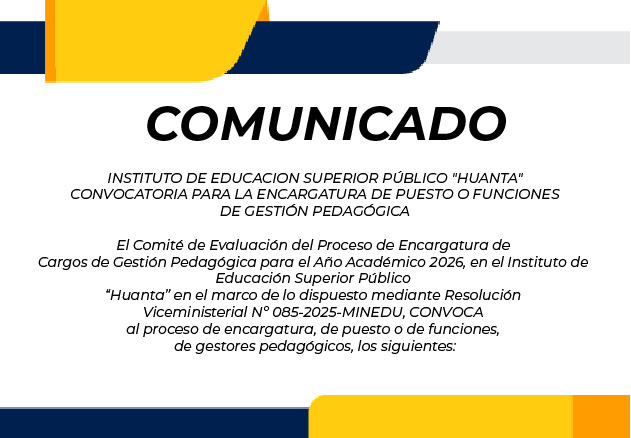 Convocatoria https://iestphuanta.edu.pe/wp-content/uploads/2026/02/Convocatoria-IESTP-Ayacucho.pdf RELACION DE PLAZAS VACANTES PARA CONTRATO DOCENTE REGULAR IES-IEST – 2026-REGION AYACUCHO https://iestphuanta.edu.pe/wp-content/uploads/2026/02/RELACION-DE-PLAZAS-VACANTES-PARA-CONTRATO-DOCENTE-REGULAR-IES-IEST-2026-REGION-AYACUCHOFF.pdf